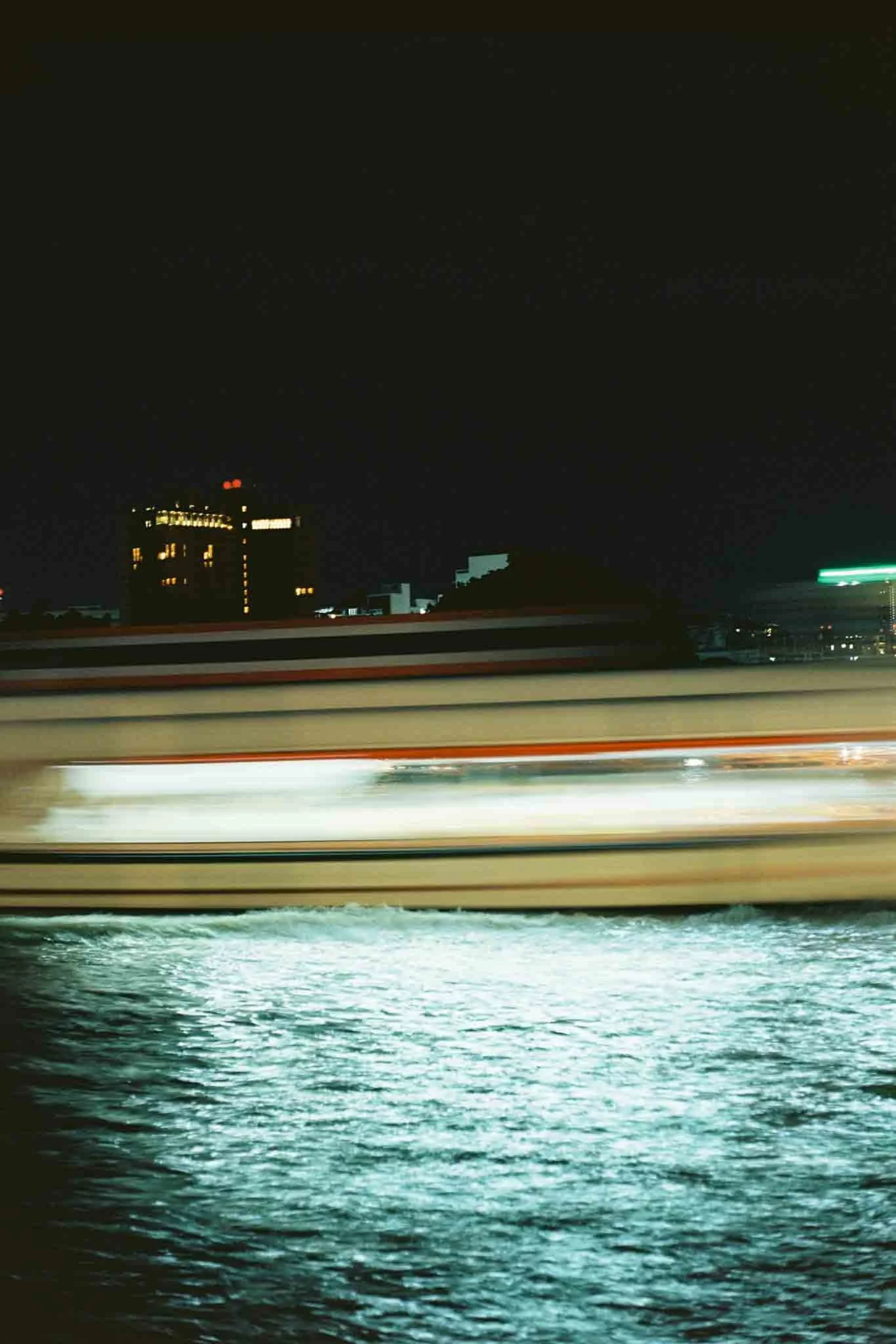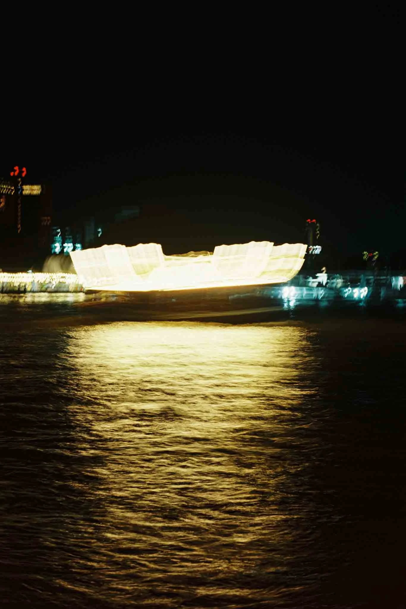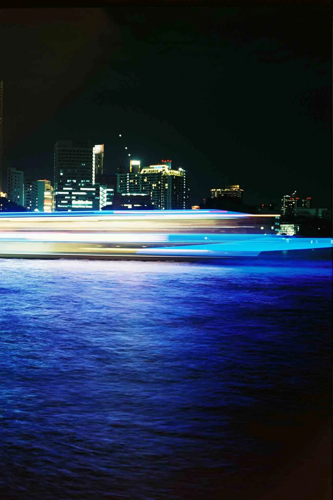 “แสงบนเจ้าพระยา (Sǣng bon Chao Phraya)” drifts along the river at night, following the slow passage of boats whose neon lights carve fleeting patterns across the water. Through long exposure, the city disappears and only colour remains, suspended between movement and stillness. The river becomes a luminous skin, where light paints its own rhythm and the night reveals a quieter pulse beneath Bangkok’s surface.