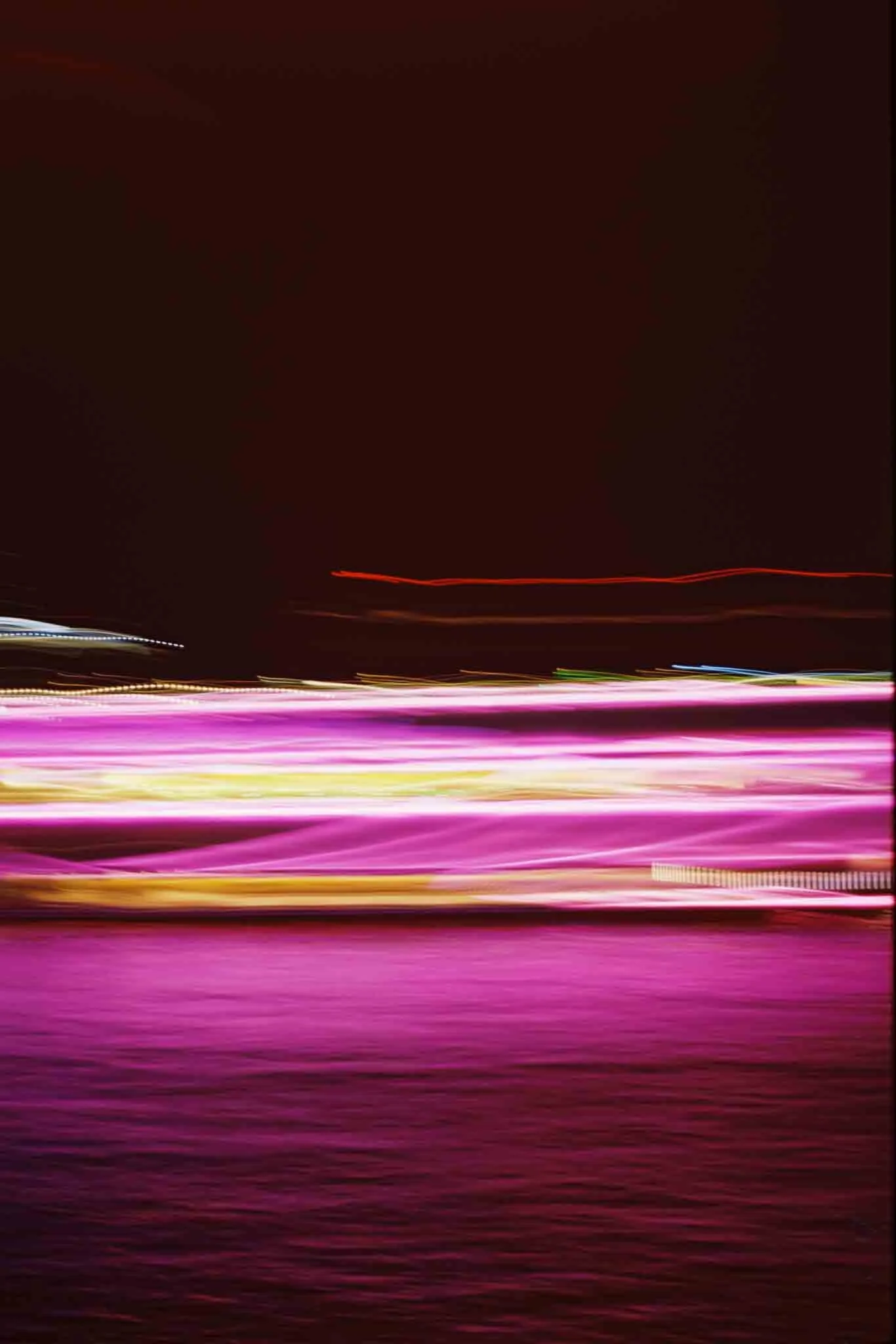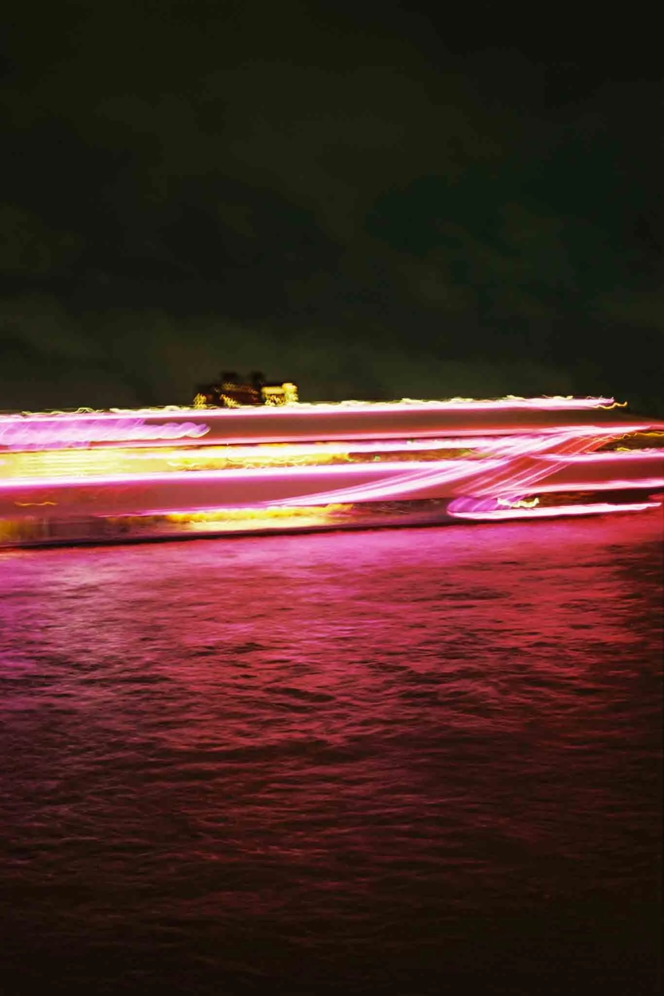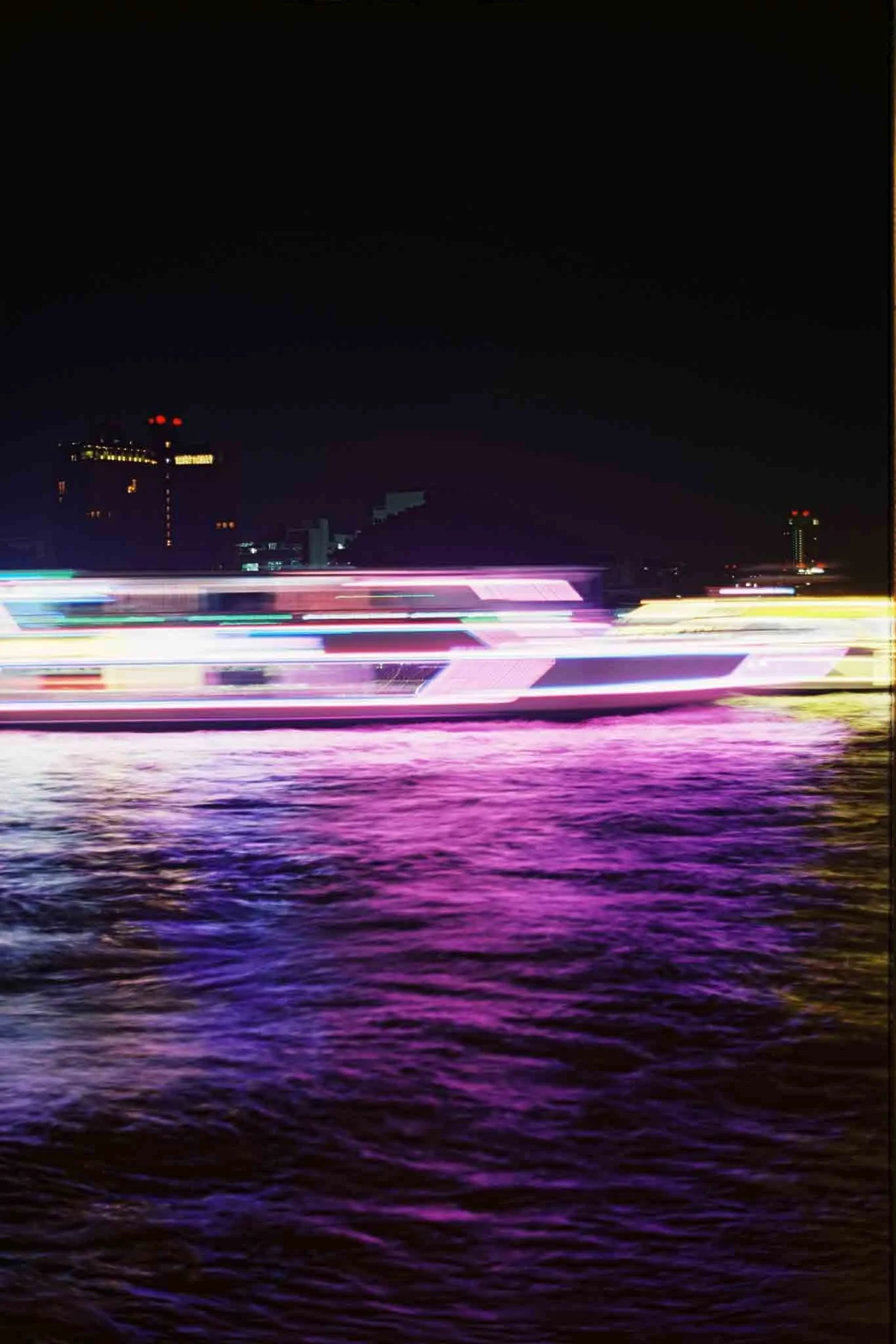 “แสงบนเจ้าพระยา (Sǣng bon Chao Phraya)” drifts along the river at night, following the slow passage of boats whose neon lights carve fleeting patterns across the water. Through long exposure, the city disappears and only colour remains, suspended between movement and stillness. The river becomes a luminous skin, where light paints its own rhythm and the night reveals a quieter pulse beneath Bangkok’s surface.